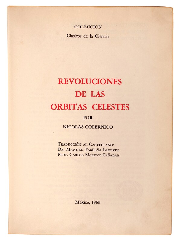 Pierwszy przekład „De revolutionibus” na język hiszpański w tłumaczeniu Manuela Tagüeňa Lacorte i Carlosa Moreno Caňadas.