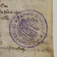 Noty: "1542, Ex Arce Tapia" - biblioteka na zamku krzyżackim w Tapiawie (naklejka na górnej okładzinie); sygn. E. 3., Aaa 51 biblioteki zamkowej w Królewcu (naklejka na górnej okładzinie); pieczęć okrągła: Königl. u. Univers. Bibliothek Königsberg i. Pr. (k. 1r)