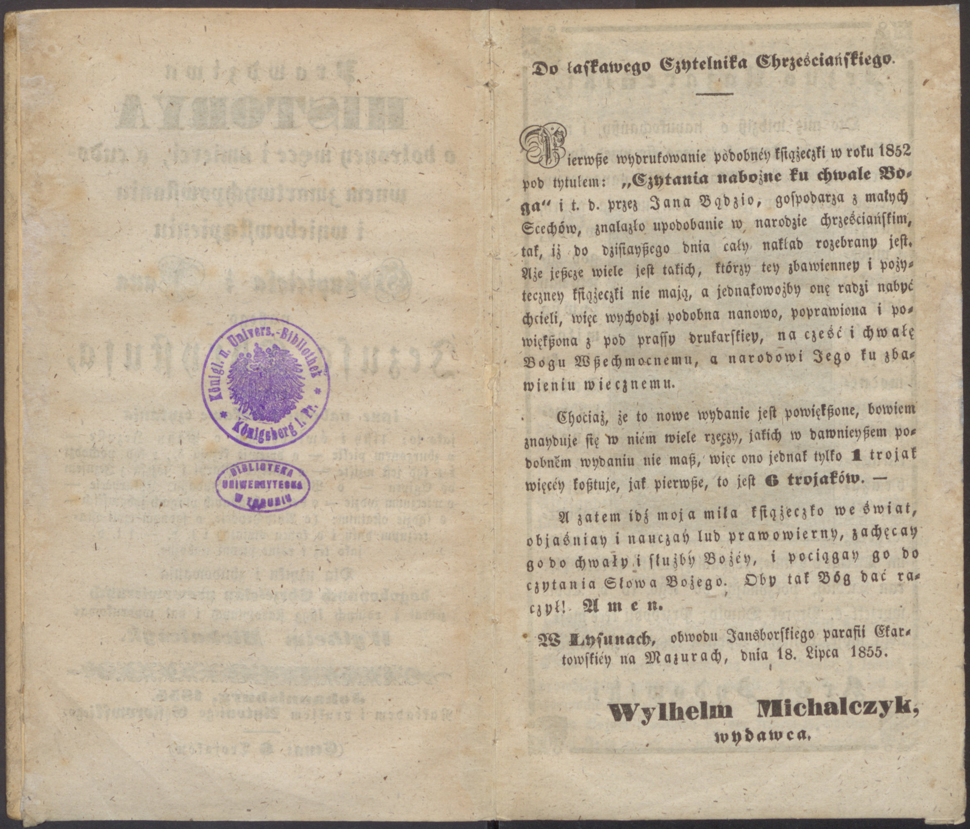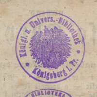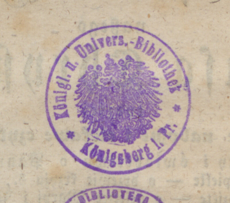 Prawdziwa historya o bolesney męce i śmierci, o cudownem zmartwychpowstaniu i wniebowstąpieniu Odkupiciela i Pana naszego Jezusa Chrystusa tudzież inne nabożne i ciekawe czytania (...) dla użytku i zbudowania bogoboynych chrześcijan prawowiernych - pieczęć okrągła z napisem w otoku: Königl. u. Universitätsbibliothek Königsberg i. Pr.