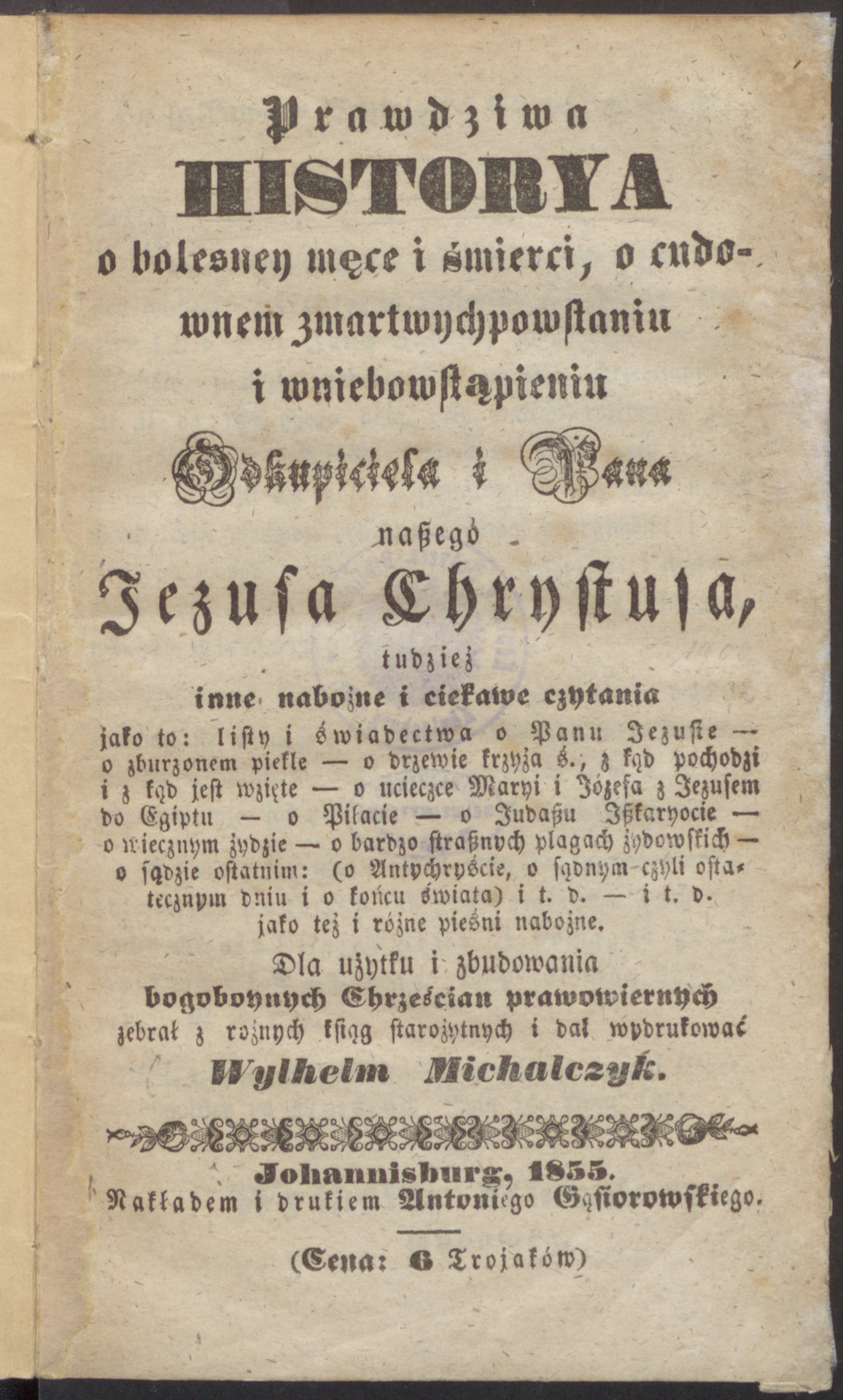Prawdziwa historya o bolesney męce i śmierci, o cudownem zmartwychpowstaniu i wniebowstąpieniu Odkupiciela i Pana naszego Jezusa Chrystusa tudzież inne nabożne i ciekawe czytania (...) dla użytku i zbudowania bogoboynych chrześcijan prawowiernych