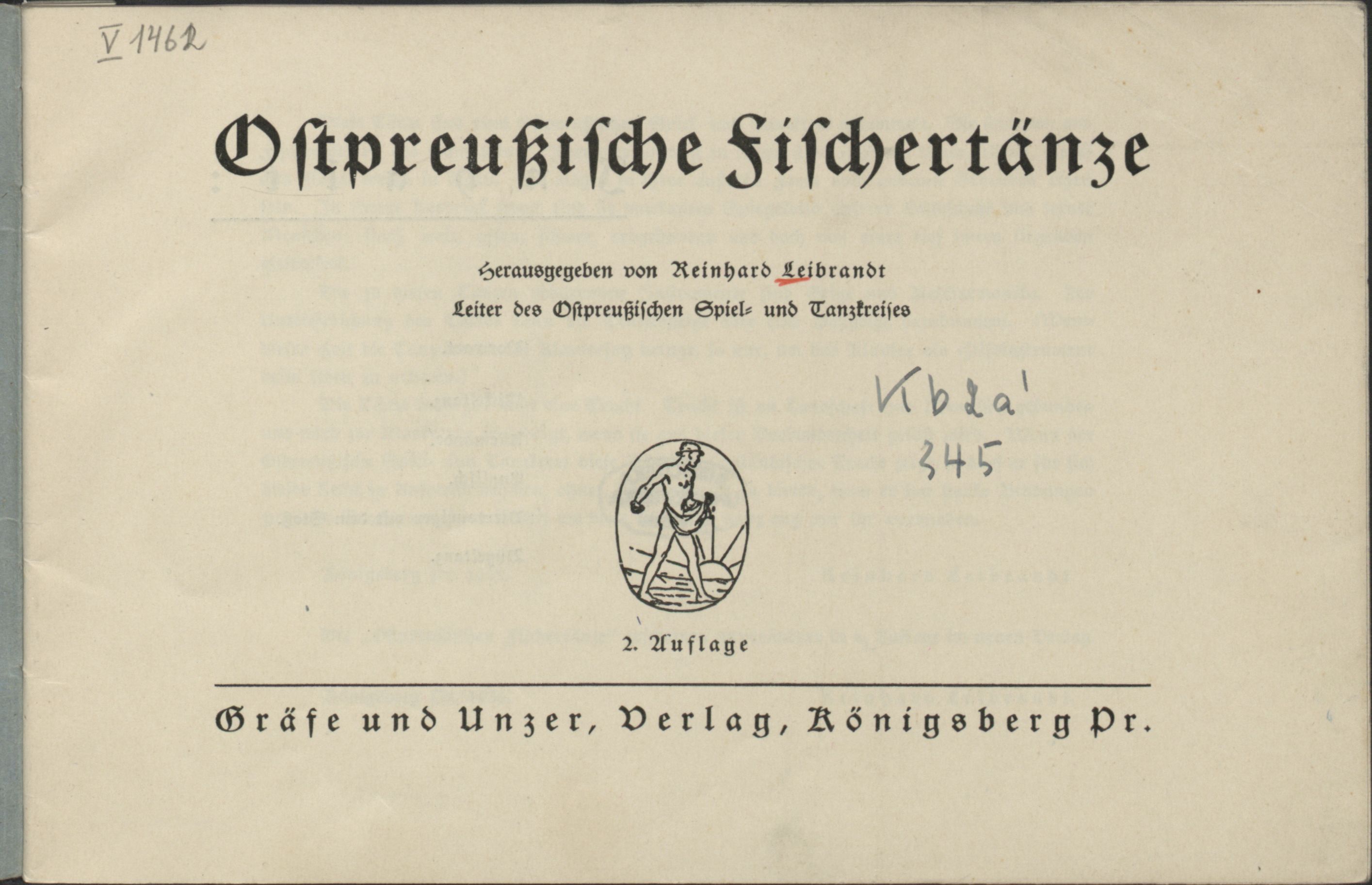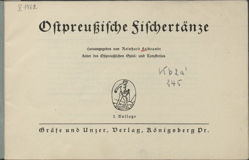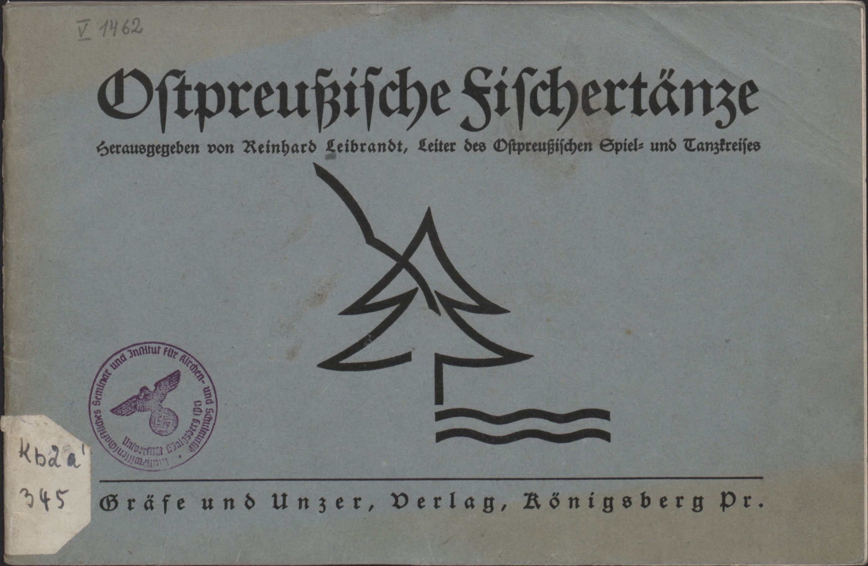 Ostpreussische Fischertänze - pieczątka okrągła: Musikwissenschaftliches Seminar und Institut für Kirchen- und Schulmusik Universitet Königsberg (Pr), biała nalepka na grzbiecie druku: kb2a' 345