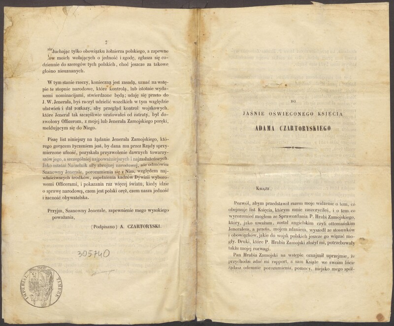 Do J. W. jenerała Rybińskiego, byłego naczelnego wodza wojsk polskich; Do Jaśnie Oświeconego księcia Adama Czartoryskiego.