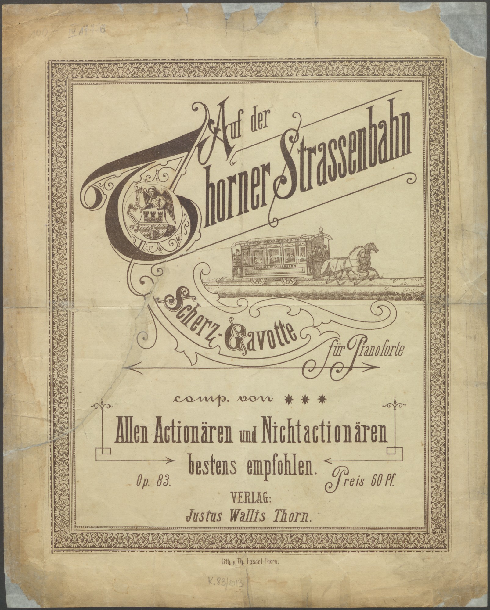 Taniec salonowy „Żartobliwy-Gawot”, utwór anonimowego kompozytora. Druk został wydany z dużym prawdopodobieństwem z okazji uruchomienia w Toruniu pierwszej linii tramwaju konnego na trasie Bydgoskie Przedmieście – Dworzec Toruń Miasto, w maju 1891 r.