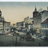 - Widok na Duży Rynek (dawny plac targowy) z wieżą ratuszową oraz nieistniejącym już pomnikiem wojennym po lewej stronie. Na rewersie: adres i korespondencja w języku polskim. W prawym górnym rogu widoczny ślad po okrągłej pieczątce. Data na podstawie korespondencji.