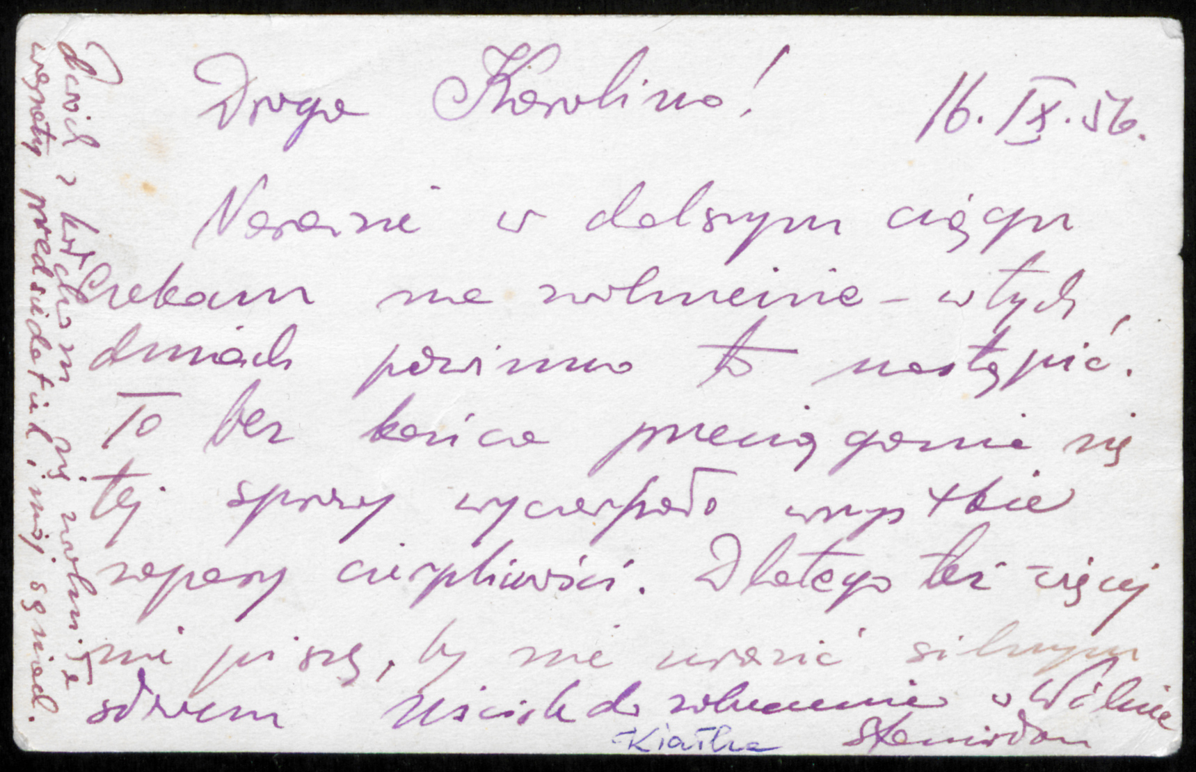 Archiwum Stanisława Kiałki (1911-1980), żołnierza września 1939 roku, oficera Armii Krajowej, sybiraka, historyka, po wojnie dokumentalisty polskiego czynu zbrojnego na Wileńszczyźnie. Na odwrocie fotografii krótka wiadomość Stanisława Kiałki do Karoliny z dnia 16 września 1956 r.