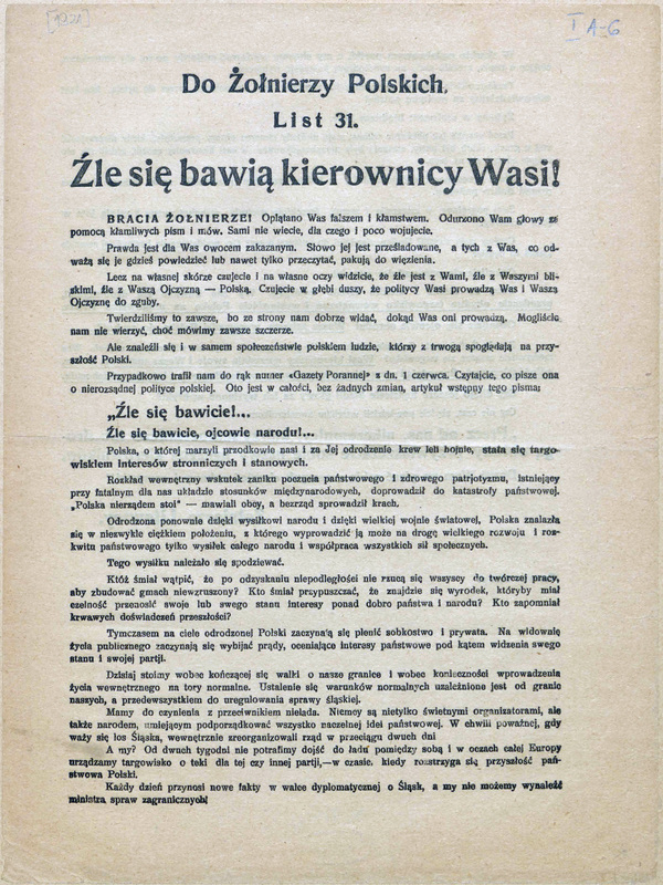 Kolejną kolekcją, o której warto wspomnieć, są druki ulotne z okresu II Rzeczypospolitej. Dokumenty te utrwalają bardzo ważne wydarzenia w dziejach Niepodległej: proces powstawania państwa polskiego w latach 1918-1919 r., wojnę polsko-bolszewicką (1919-1921), konflikty: polsko-ukraińskie i polsko-litewskie, zabójstwo prezydenta II RP Gabriela Narutowicza w 1922 r. czy zamach stanu w 1926 r. Zbiór ten może służyć za świadectwo procesów społecznych zachodzących w czasie budowania nowej państwowości m.in. wzrostu świadomości wpływu na życie polityczne kraju.