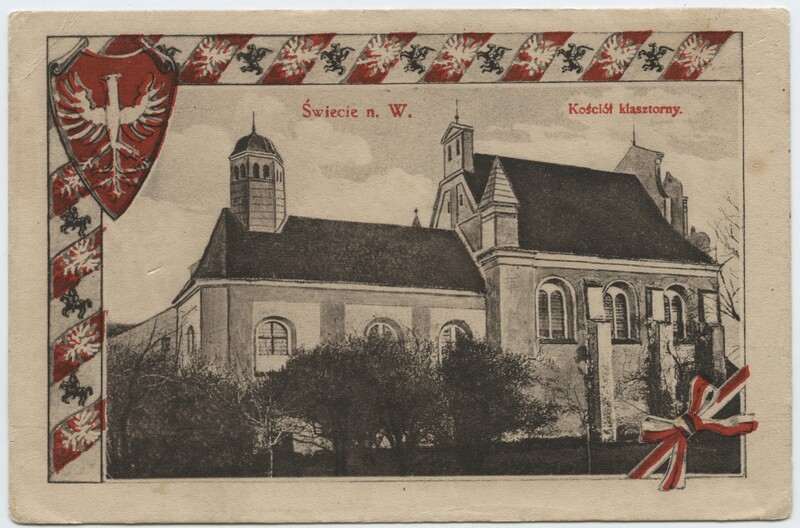W okresie wzmożonych starań Polaków o odzyskanie niepodległości na pocztówkach zaczęły pojawiać się motywy patriotyczne, takie jak Orzeł Biały, czy polska flaga. Motywy te ukazywały się również tuż po odzyskaniu niepodległości i w okresie międzywojennym. Przykładem takich pocztówek są karty z kościołem klasztornym oraz zamkiem w Świeciu nad Wisłą opatrzone biało-czerwoną bordiurą z motywem Orła Białego i Pogonią .