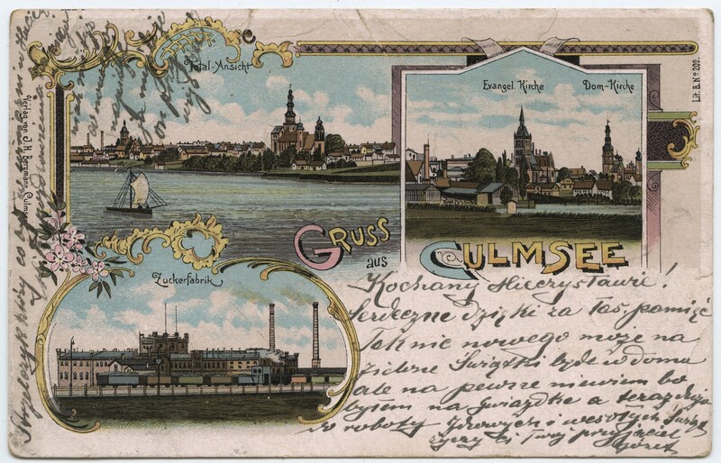 Do ciekawych przykładów należy pocztówka–cegiełka Komitetu Budowy Kościoła Garnizonowego w Inowrocławiu z 1927 r. przedstawiająca projekt tegoż gmachu. Nie brakuje także oryginalnych litografowanych pocztówek, projektowanych często przez znanych artystów malarzy i ilustratorów. Przykładem może być pochodząca z 1901 r. pocztówka wykonana techniką chromolitografii z pozdrowieniami z Chełmży Gruss aus Culmsee, która przenosi nas do tego pięknego i zabytkowego miasta, ukazując na trzech obrazkach panoramę miasta, ówczesny Kościół Ewangelicki wraz z Katedrą oraz cukrownię z jadącym przed nią parowozem z wagonami [KP.29].