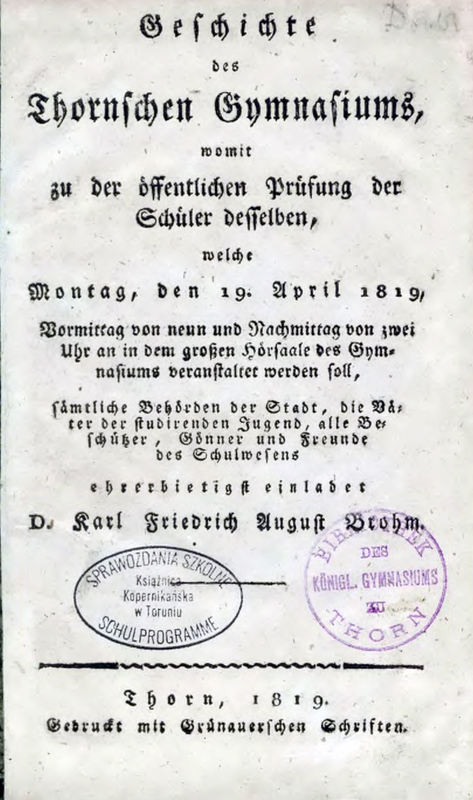 Najstarsze sprawozdania pochodzą z 1825 r. z gimnazjum w Braniewie, z 1826 r. z Torunia oraz z Bydgoszczy i Chojnic z 1828 r. Ostatnie druki są z lat 30. XX w. Wczesne publikacje zawierają przede wszystkim informacje o działalności szkoły, wykazy nauczycieli, przedmiotów, informacje o uczniach, wykazy lektur, teksty rozpraw nauczycieli (czasem ukazywały się osobnym drukiem), np. zasłużonego dyrektora gimnazjum w Braniewie dr. filozofii Marii Gideona Gerlacha (1789-1845) z Wrocławia.